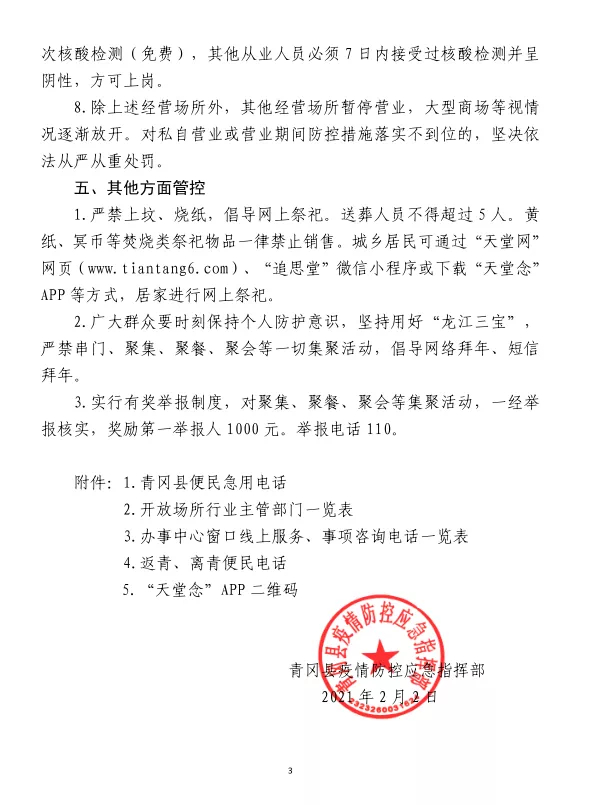 2。广大群众要时刻保持个人防护意识,坚持用好“龙江三宝”,严禁串门、聚集、聚餐、聚会等一切集聚活动,倡导网络拜年、短信拜年。