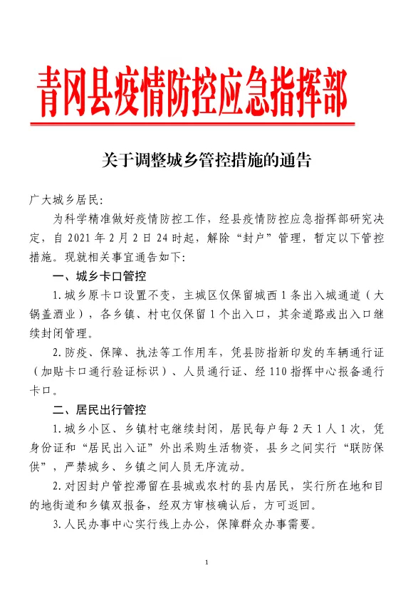 记者从青冈县疫情防控应急指挥部了解到,为科学精准做好疫情防控工作,经县疫情防控应急指挥部研究决定,自2021年2月2日24时起,解除“封户”管理,暂定以下管控措施。现就相关事宜通告如下∶