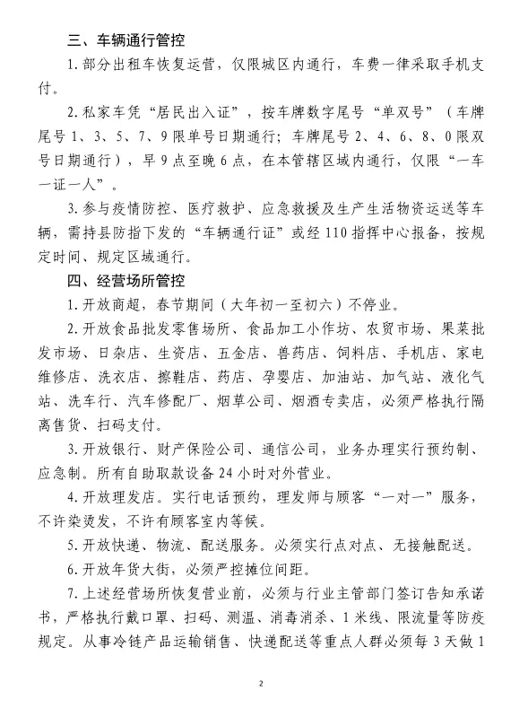 3。参与疫情防控、医疗救护、应急救援及生产生活物资运送等车辆,需持县防指下发的“车辆通行证”或经 110指挥中心报备,按规定时间、规定区域通行。