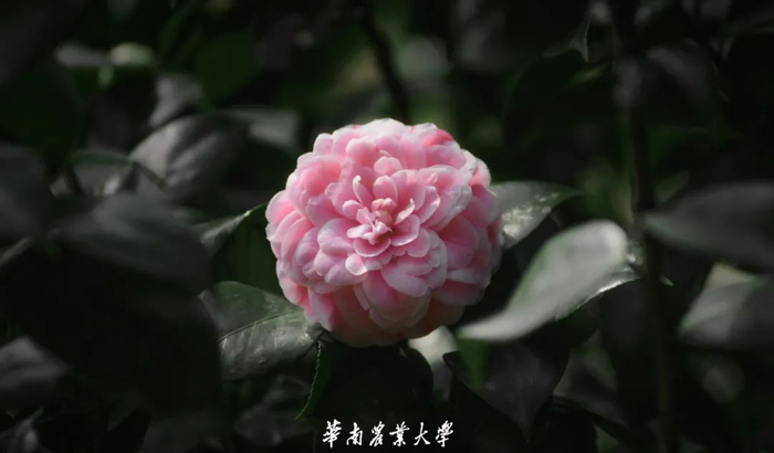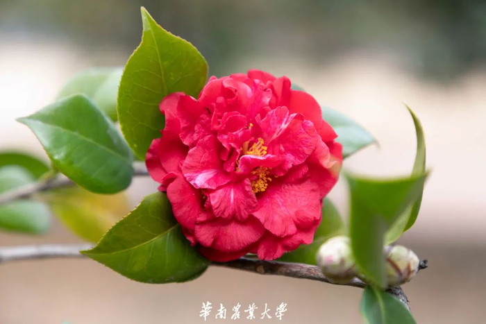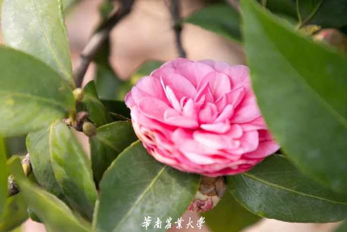 茶花,又名山茶花,是山茶科、山茶属多种植物和园艺品种的通称。花瓣为碗形,分单瓣或重瓣。茶花有各色花种,花枝最高可以达到4米。性喜温暖、湿润的环境。花期较长,从10月份到翌年5月份都有开放,盛花期通常在1-3月份。华农校园中,茶花多分布在校史馆附近。