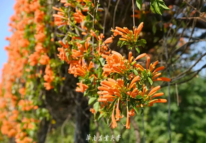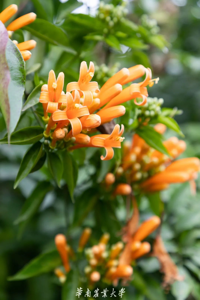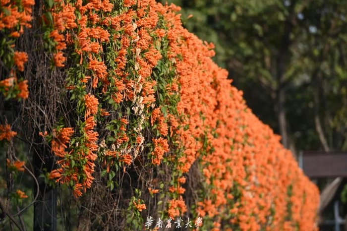 炮仗花,原产南美洲巴西,在热带亚洲已广泛作为庭园观赏藤架植物栽培。多植于庭园建筑物的四周,攀援于凉棚上,初夏红橙色的花朵累累成串,状如鞭炮,故有炮仗花之称。华农校内的炮仗花主要分布于鄱阳湖岸的过道处。