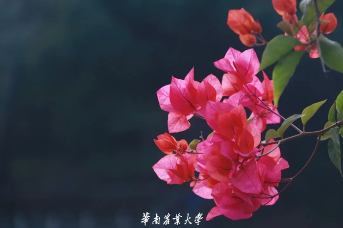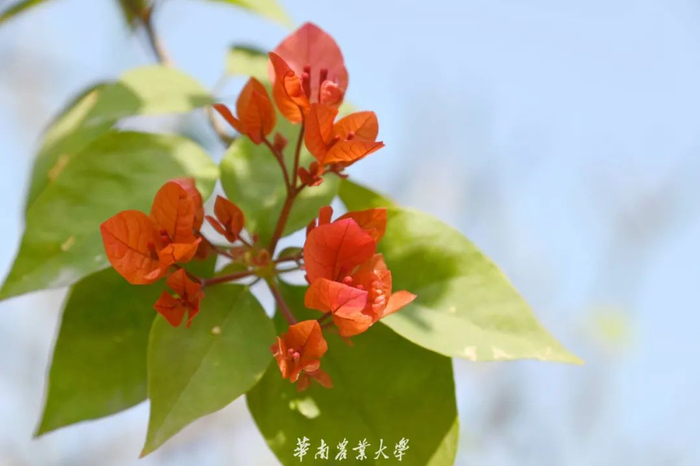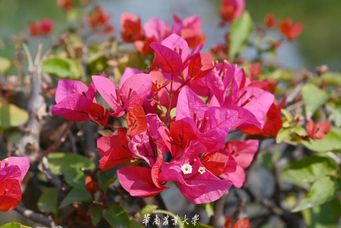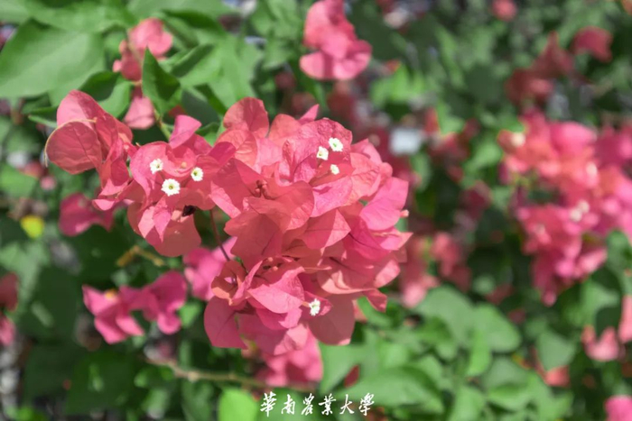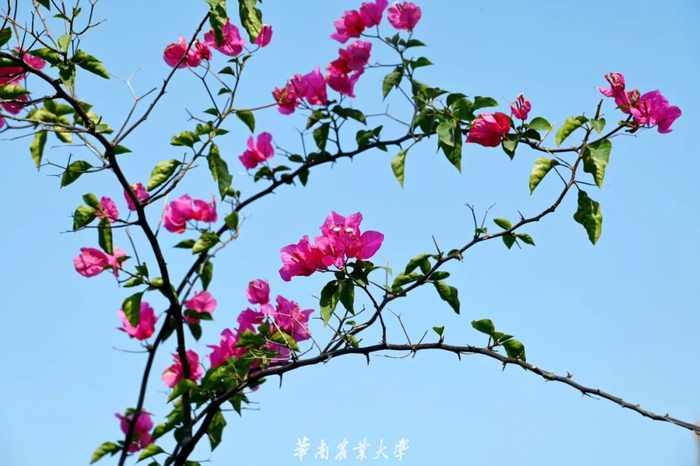 簕杜鹃,别名三角梅、叶子花等。植株适应性强,极易成活。花开时因成片开放,色彩艳丽而深受人们喜爱,故也多作为绿化带植物,广泛分布于华农校园各处。