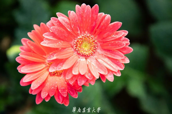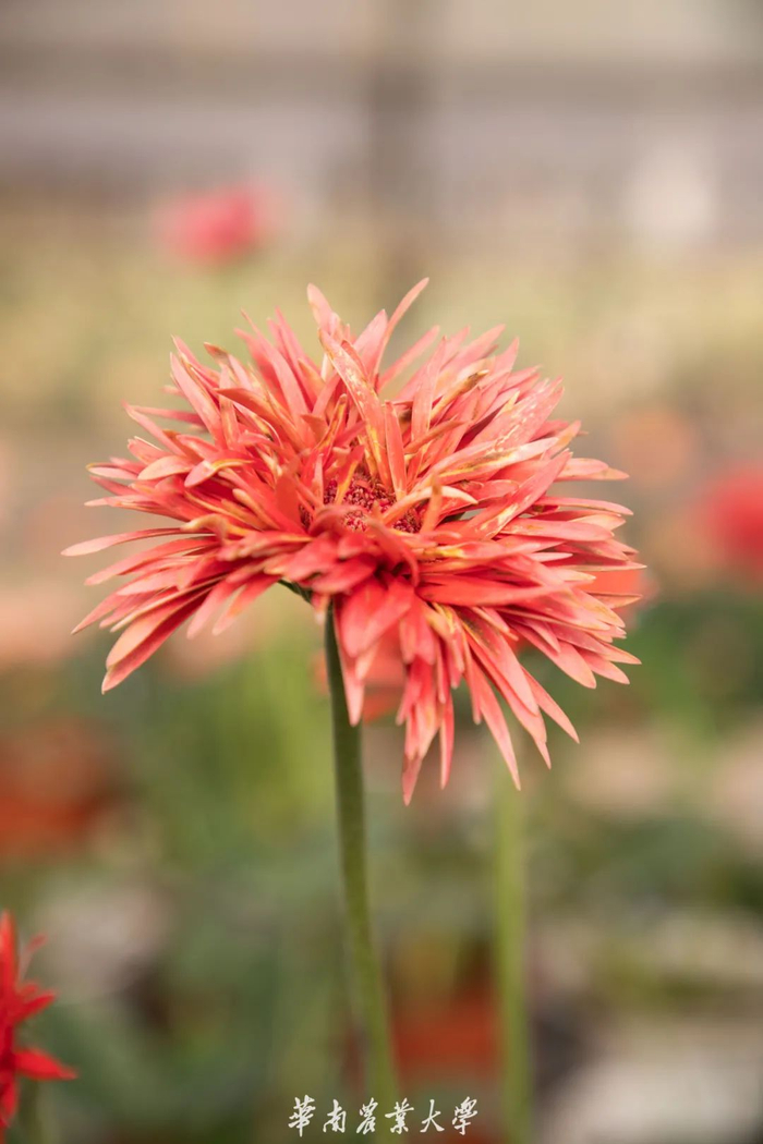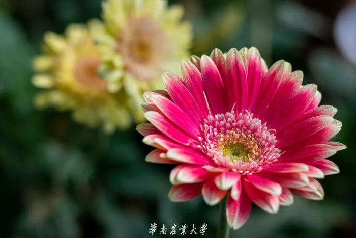 非洲菊又名扶郎花,为世界五大切花之一。非洲菊花型奇特、色彩艳丽、花枝挺拔,有单瓣、半重瓣、重瓣、拉丝和扭瓣等的栽培品种。它总是给人一种积极乐观和活泼开朗的感觉,像小太阳般充满活力。非洲菊图片摄于华农校内的集香园。