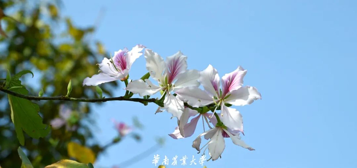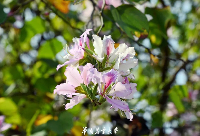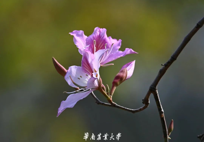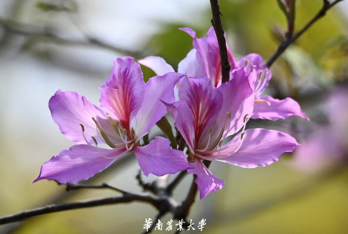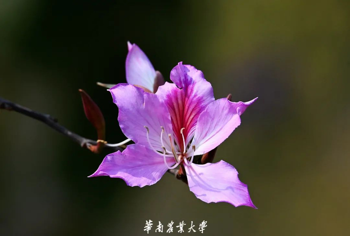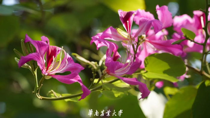 紫荆花豆科紫荆属,落叶乔木或灌木。花色有紫红和纯白,形如蝴蝶,景色奇特,当叶子还没长出时,枝条上花已盛开,所以又称“满条红”,是家庭和美、骨肉情深的象征。华农校内遍植紫荆,处处可见其身影。