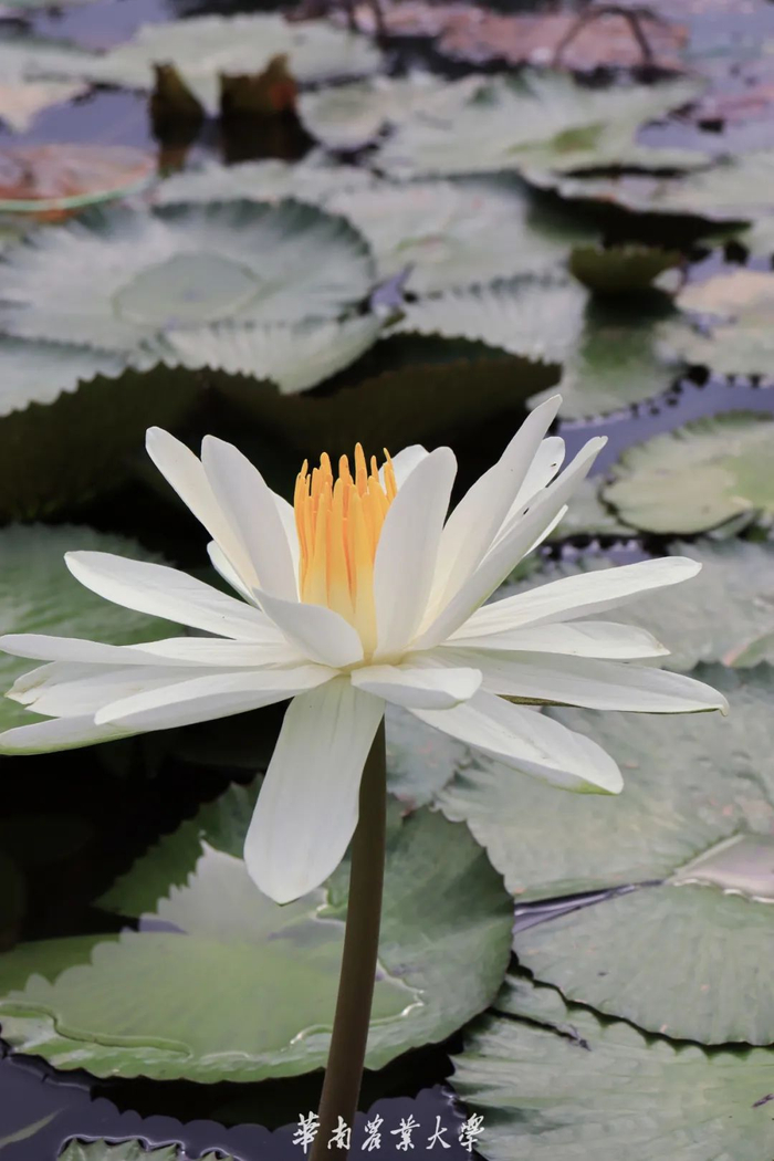 睡莲是多年生浮叶型水生草本植物,叶子和花浮于水面,花单生,花有大小与颜色之分,浮水或挺水开花。昼开夜合,因此也被誉为“花中睡美人”。莲根能吸收水中铅、汞、苯酚等有毒物质,是城市中难得的水体净化、绿化、美化植物。校园内的睡莲主要分布在湿地公园的鄱阳湖。