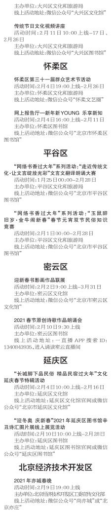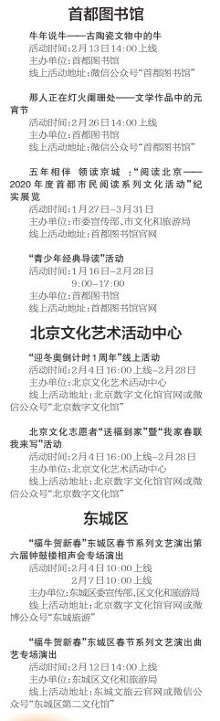春节、元宵节期间,全市各级公共文化服务机构将开展专场演出、民俗讲座、专题展览、送福慰问、阅读服务等各类重点线上群众文化活动358项;提供数字文化资源库224个,涵盖电子阅览、有声读物、虚拟展厅、艺术普及慕课、文艺鉴赏、绘本连环画、讲座讲坛等内容。首都图书馆为读者提供中华连环画数字阅读馆、中文在线电子书等18个资源库;北京文化艺术活动中心推出系列全民艺术普及资源,涵盖京剧、交响乐、昆曲、曲剧、插花、摄影等教学课程129集;各区也将推出各具特色的数字文化资源,丰富在京过年的市民群众的精神文化生活。此外,在落实好疫情防控措施的前提下,全市公共图书馆、文化馆等公共文化服务机构将继续采取预约、限流、错峰方式开放场馆,为在京的市民群众提供公共文化服务。