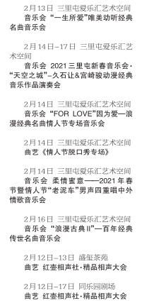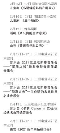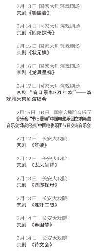 信公众号播出,观众在整个正月期间可免费点播,足不出户看名家名团名剧。舞台有界·艺术无边——文学艺术奖获奖剧目将于春节期间,在优酷平台进行为期一个月的免费线上展播。各院团也将推出一系列精彩线上演出共庆佳节。如:国家大剧院将在线上首次推出国家大剧院艺术放映厅——线上舞台艺术影像展新春特别策划;北方昆曲剧院从大年初一起,连续7天在北方昆曲剧院微信直播间免费播出《牡丹亭》《西厢记》《逆行者》等精彩剧目。