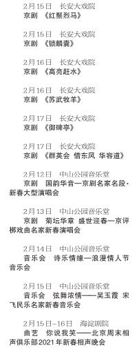 春节假日期间(2月11日-2月17日),全市将推出重点线上演出活动32项,同时,在做好疫情防控的前提下有序开展线下演出,共计 58台 159场,为在京过年的市民群众提供精彩纷呈的“演 出 大 餐 ”。“戏 韵 动 京城”——第四届京津冀文艺院团新春线上展演将于大年初一在“北京市剧院运营服务平台”微