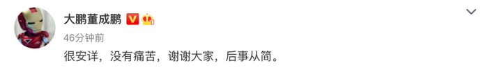 “很安详,没有痛苦,谢谢大家,后事从简。”