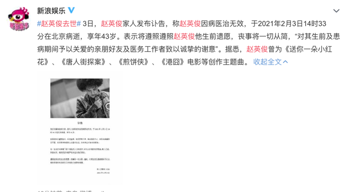 音乐人赵英俊因病医治无效,2021年2月3日14时33分,在北京病逝,享年43岁。