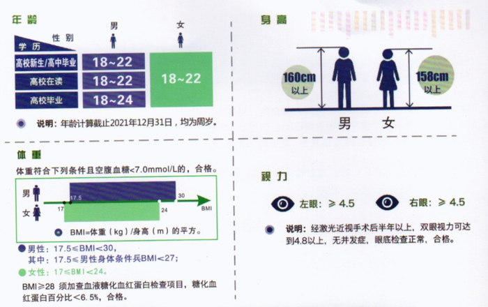 年龄:男性普通高等学校在校生为年满17至22周岁、大学毕业生放宽到24周岁。