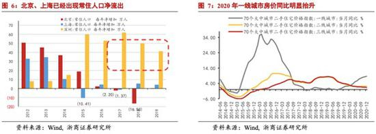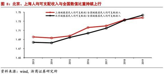 我们认为根本原因在于——高收入群体的净流入才是决定超大城市房价的关键因素。不论是基于人才引进等政策吸引还是通过产业发展等方式吸纳,高收入人群流入一线城市的趋势相对持续,这一力量可推动一线城市房价继续上行;另一方面,从资产配置角度来看,一线城市地产具备核心资产的金融属性,作为保值增值标的,也是高收入人群财富管理的重要方式。我们以常住人口开始呈现净流出的北京和上海为例,计算所得的北京、上海的城镇人均可支配收入与全国城镇人均可支配收入比值近年来持续上行,正是由于高收入群体仍然维持净流入,其旺盛需求和购房能力推动城市房价上行。