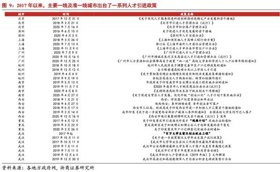 在大国大城的政策指引下,2017年以来各大城市纷纷出台了一系列“抢人才”政策,抢人对象主要以青年大学生、优秀高技术人才、战略性新兴行业从业人员等,在人才引进政策的配合下,优秀人才和高收入群体进一步向大城市集聚。目前来看,部分城市的抢人政策中,已经涉及了“零门槛落户”、人才公寓、租房购房补贴和优惠贷款等政策。