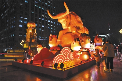 昨天傍晚5点多,记者在东城区前门大街正阳门对侧看到,“金牛送福”春节景观小品已经亮起彩色灯光。这处景观以红色为主色调,中央摆放着一个福字窗花造型,周边配着祥云和蝴蝶元素。在福字四周还围着6个起舞的卡通金牛。