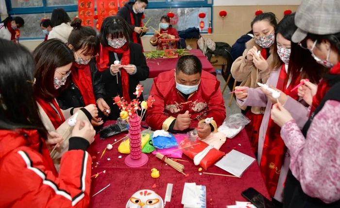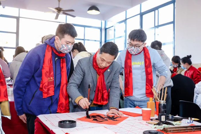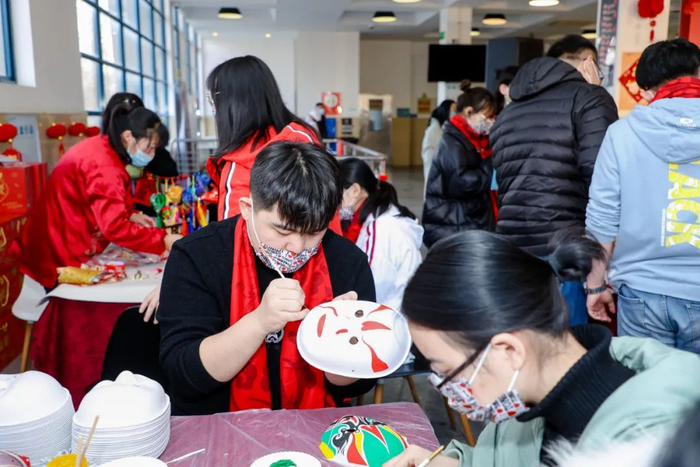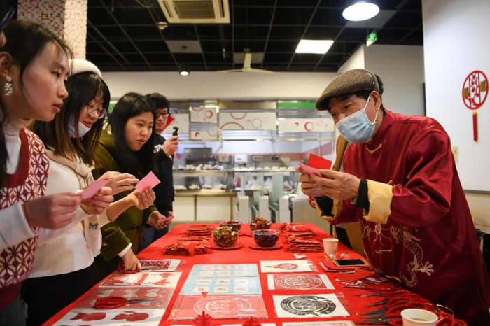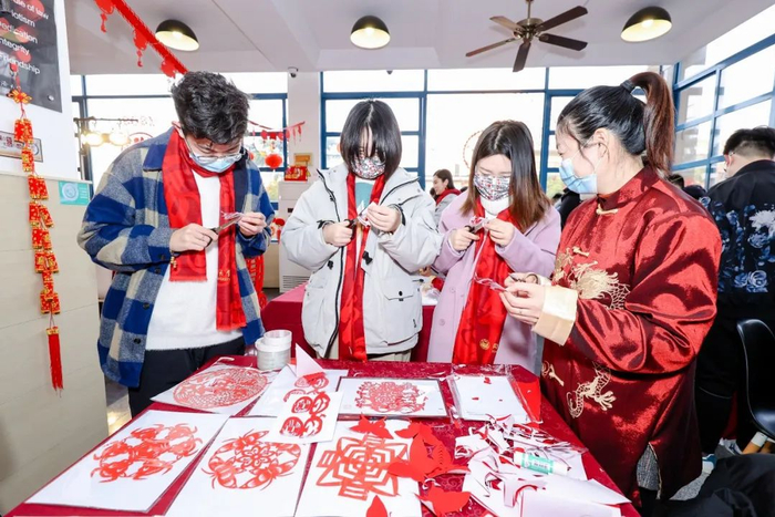 有的正泼墨挥毫,书写春联和“福”字;有的正穿针引线,制作香包;有的正手握剪刀,剪出一件件充满年味的剪纸作品……2月4日下午3时半,迎新春传统文化体验系列活动在两校区四个会场同时开场。捏面人、脸谱制作、书法、草编艺术、香包制作、剪纸艺术、中国结制作、龙凤字,留校学子在教师的指导下,饶有兴致地一一动手体验。