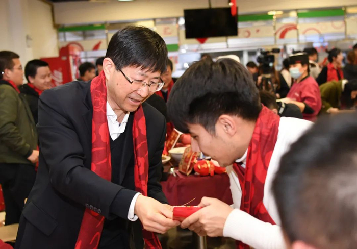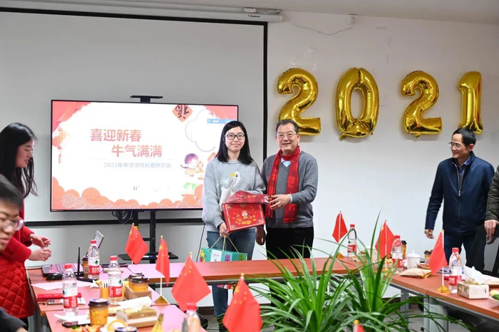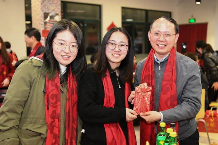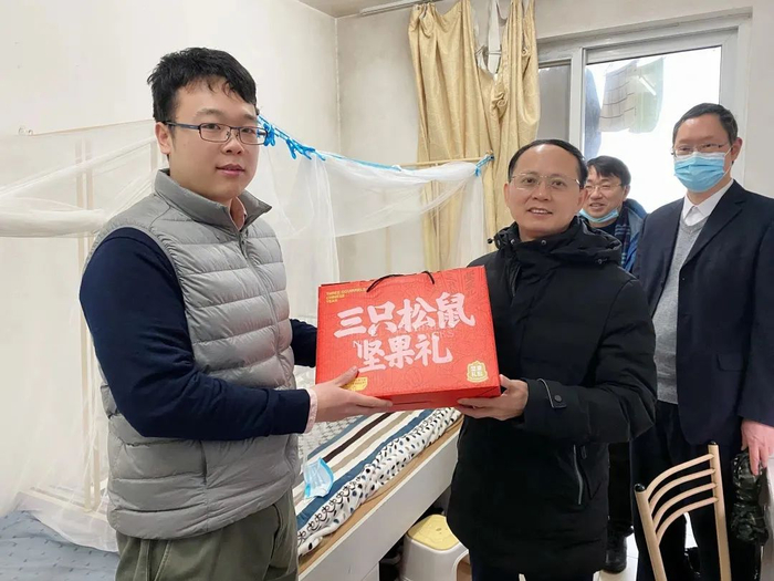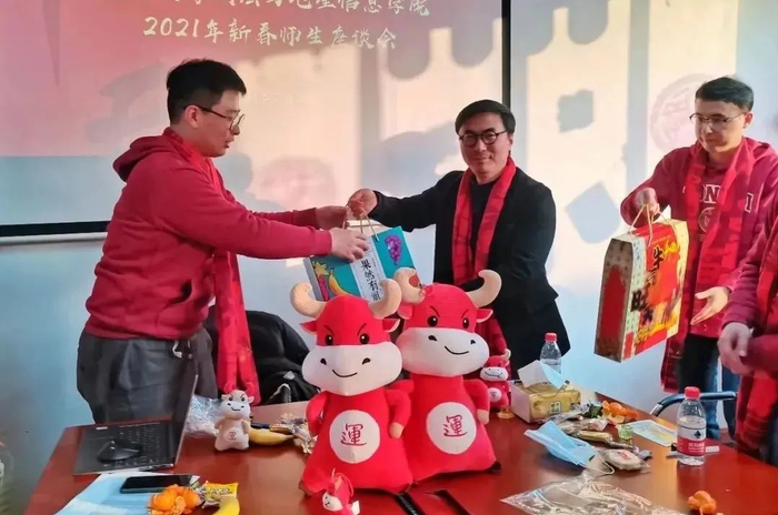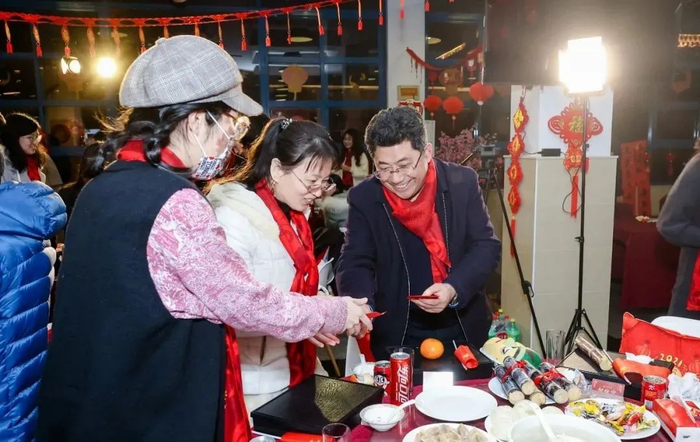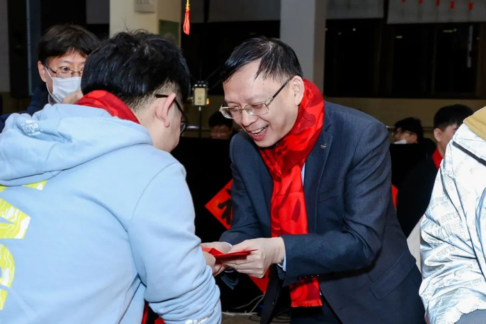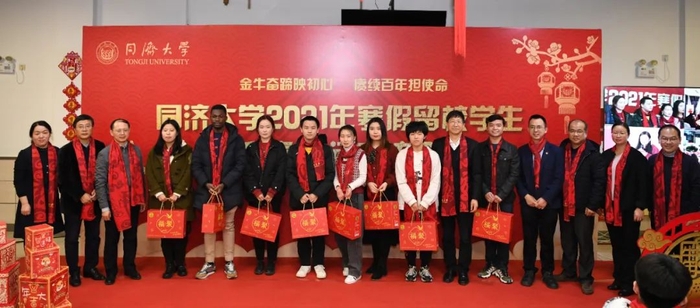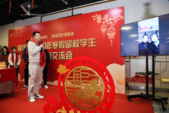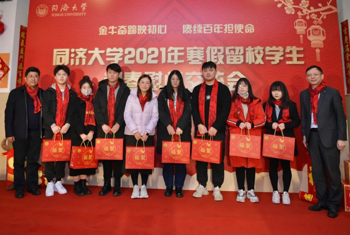 校领导与师生同系“同济红”围巾,为留校学生送上了精美的新年大礼包(含有新年玩偶、除夕至大年初六的餐券、水果礼盒、防疫包等)及新年压岁包,祝愿同学们新年快乐,在新的一年里取得更大进步。学生代表也向参会老师赠送福袋,衷心感谢老师们时时处处所给予的贴心暖心的家人般关怀。