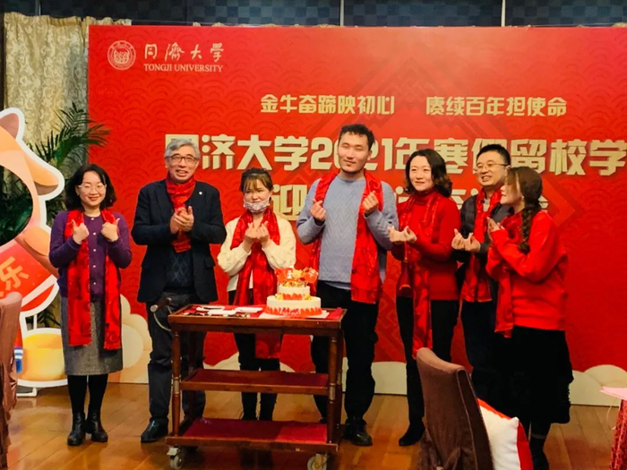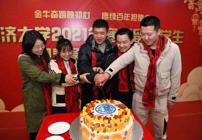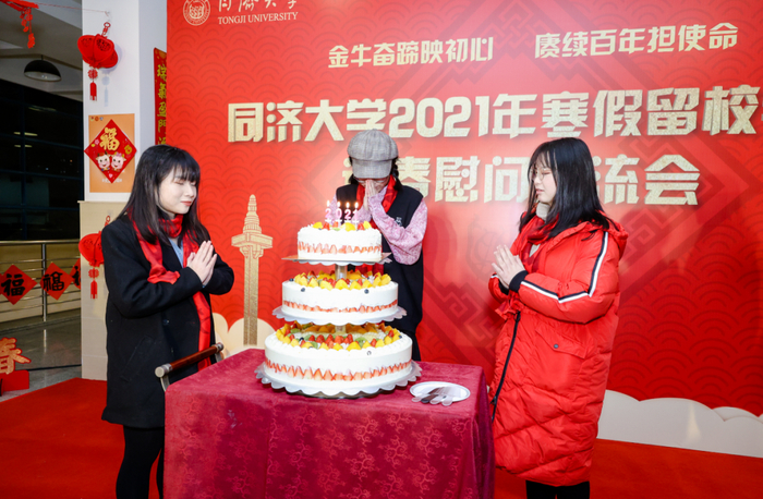 “老爸老妈,请你们放心,有同学、老师陪我一起过年。今天还和老师们、同学们在小年夜一起过生日,很开心!”在当天举行的同济大学寒假留校学生迎春慰问交流会上,医学院本科生李杰看到学校为他准备的生日蛋糕,既感惊喜又感意外,他还与远方的家人进行了视频连线,心里感到格外温暖。当晚,同济大学为在现场参加活动的11名2月份生日的留校学子集体过生日,送上生日祝福。