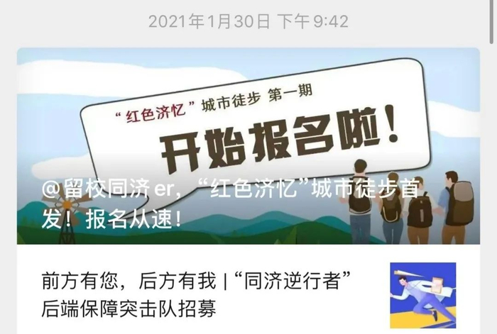 “‘红色济忆’寒假城市徒步活动第二期开始啦!本次活动带你一起走近黄浦江畔的红色印记,包括申报馆旧址、公共租界工部局旧址、陈毅广场、黄浦公园(人民英雄纪念塔)等。欢迎留校学生报名。”2月1日,一则通知在“青春同济”公众号上发布,吸引了不少留校学子的关注。继城市徒步第一期2月3日圆满落幕后,第二期活动将于2月5日下午进行。
