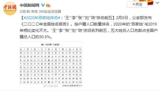 2月8日,公安部发布《二〇二〇年全国姓名报告》。按户籍人口数量排名,2020年的“百家姓”与2019年相比变化不大。“王”“李”“张”“刘”“陈”依旧名列前五,五大姓氏人口总数占全国户籍总人口的30.8%。