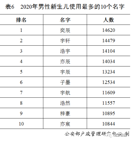 2020年出生并已经进行户籍登记的男性新生儿中,使用频率最高的10个名字依次为:“奕辰”“宇轩”“浩宇”“亦辰”“宇辰”“子墨”“宇航”“浩然”“梓豪”“亦宸”。与2019年相比,“奕辰”首次入围并登顶榜首,成为男性新生儿父母起名的首选,“亦辰”“宇辰”“亦宸”也进入前十。