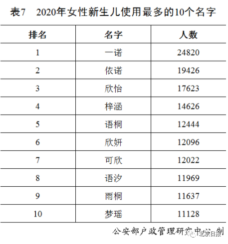 2020年出生并已经进行户籍登记的女性新生儿中,使用频率最高的10个名字依次为:“一诺”“依诺”“欣怡”“梓涵”“语桐”“欣妍”“可欣”“语汐”“雨桐”“梦瑶”。与2019年相比,“一诺”“依诺”“欣怡”依旧位列三甲,“语桐”“可欣”“语汐”“梦瑶”进入前十。