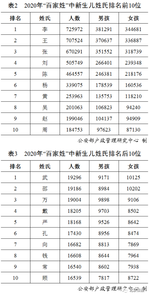 截止到2020年12月31日,2020年出生并已经到公安机关进行户籍登记的新生儿共1003.5万,其中男孩529.0万,占52.7%,女孩474.5万,占47.3%。2020年“百家姓”中新生儿登记姓氏最多的是“李”,共72.6万人,最少的是“顾”,仅1.7万人。