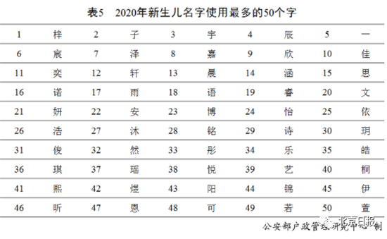 2020年出生并已经进行户籍登记的新生儿名字中,使用频率最高的50个字依次为“梓”“子”“宇”“辰”“一”等。与2019年相比,“玥”“伊”“昕”“可”等字受到新生儿父母的青睐。
