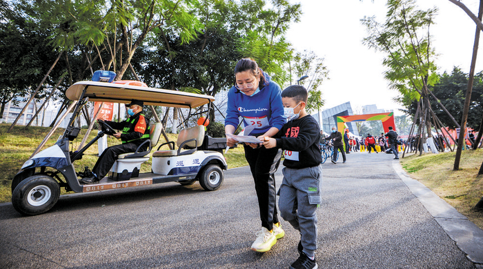 值得一提的是,主办方坚持“疫情防控常态化”原则,赛事活动举办期间高度重视疫情防控工作,严格遵守和执行疫情防控相关规定和要求,不仅全员凭健康码、行程卡等入场。比赛也不是惯常地让选手一起出发,而是采取单双号两人一组的方式,每组间隔30秒出发,“这样做是确保参赛人员保持社交距离。”主办方工作人员解释道。除此之外,记者还在现场看到各个工作点都设有体温枪、消毒用品等,医疗和临时隔离点也配置齐全。