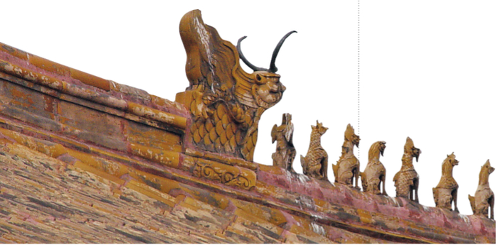 紫禁城古建筑屋顶的瑞兽数量可为1个、3个、5个、7个、9个。瑞兽排列有序,天马、海马可互换,狻猊、押鱼可互换,数量均为单数。
