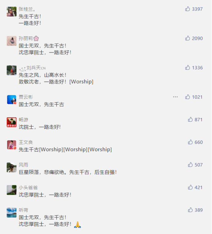 沈忠厚院士逝世后,李克强、王岐山、王晨、刘鹤、孙春兰、陈希、张德江、吴官正、王勇、肖捷、刘延东等党和国家领导同志分别通过发来唁电、敬献花圈等多种方式表示悼念,并向其亲属表示慰问。