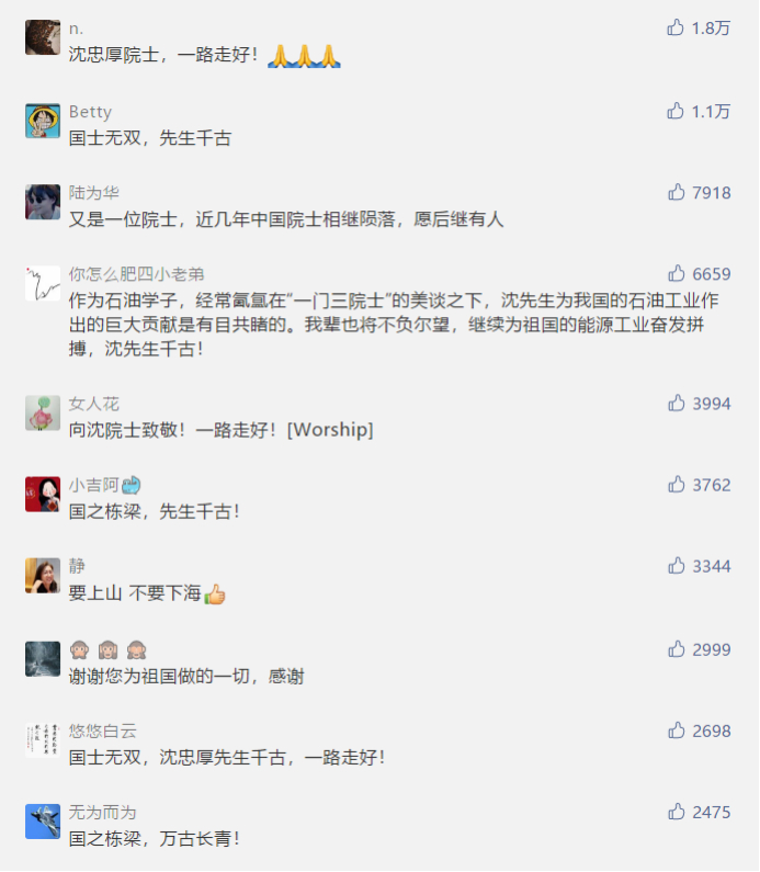中共中央组织部、教育部、科技部、中国工程院、国家自然科学基金委员会、中国石油、中国石化、中国海油、北京市委教育工委、北京市教委、山东省委组织部、陕西延长石油(集团)有限责任公司等上级部门、企事业单位及其负责同志,以及兄弟高校、学术组织等单位和个人发来唁电、唁函或敬献花圈,深切悼念沈忠厚院士。广大师生校友和沈忠厚院士生前友好也通过多种方式表达沉痛悼念和深切缅怀。