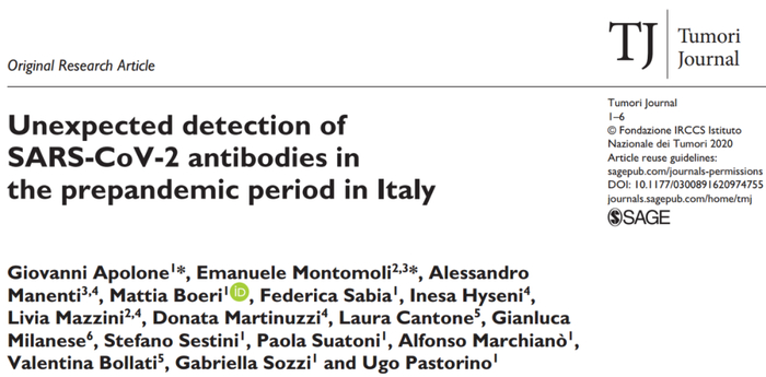米兰国家肿瘤研究所等机构论文《意大利疫情大流行前意外检测到的新冠病毒抗体》