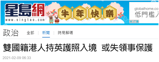 据香港“星岛网”2月9日报道,英国驻港总领事馆8日更新外游指引,称得知香港不承认“双重国籍”,持英国护照入境仍可能被视为中国公民,驻港总领馆未必能向有关人士提供相关领事保护。