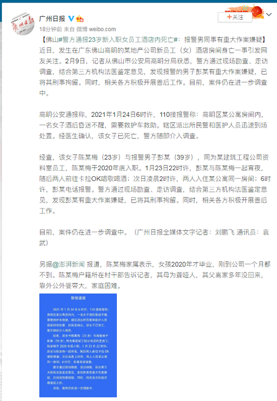 原标题: 佛山警方通报23岁新入职女员工酒店内死亡:报警男同事有重大作案嫌疑