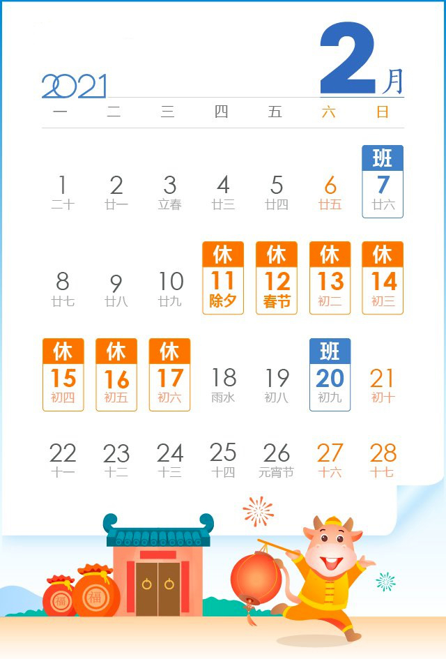 2021年春节放假安排时间:2月11日至2月17日放假调休,共7天。2月7日(星期日)、2月20日(星期六)上班。