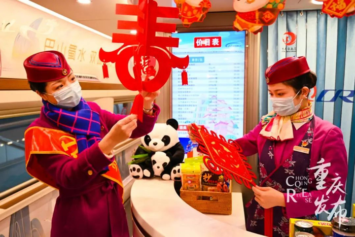 重庆客运段乘务员精心准备了灯笼、新年挂件等新年喜庆物品,装饰车厢。高铁车厢内洋溢着浓厚的节日氛围,提高了旅客乘车体验感。