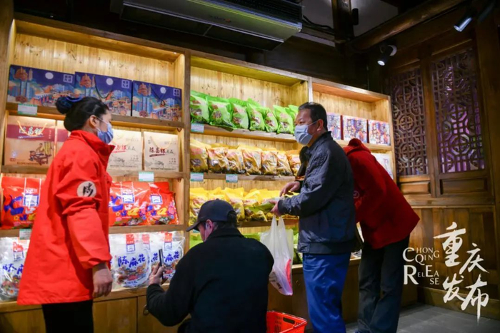 重庆磁器口古镇后街,游客在店内选购陈麻花特产。