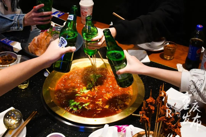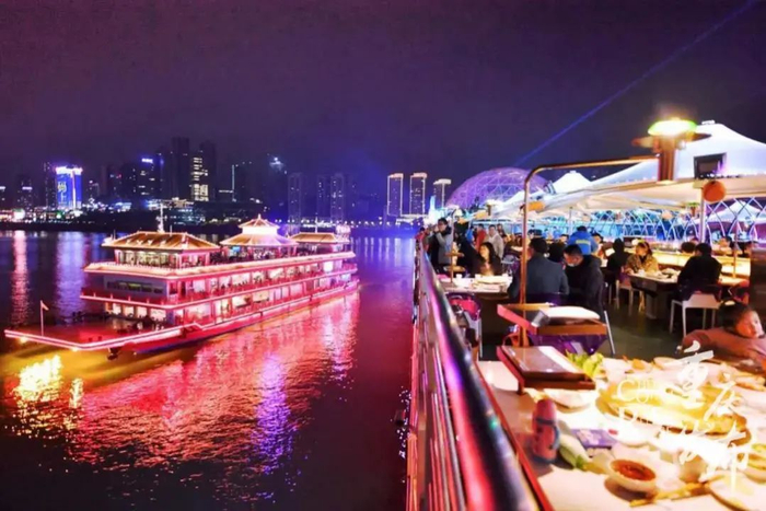 在船上吃火锅对于大多数重庆人来说都是第一次,在这里吃火锅能看到重庆很多地标性建筑,比如来福士、大剧院、洪崖洞等。周师兄火锅供图