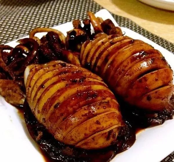 红烧乌贼体现了舟山人做菜善于利用各类调料的特点。拿酱汁拌饭,那叫一个香!