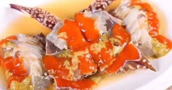 红膏炝蟹是舟山人年夜饭上的重头戏。把活螃蟹放到浓盐水中浸泡4小时左右,再拿出来切块,甜嫩的红膏炝蟹就做好啦~
