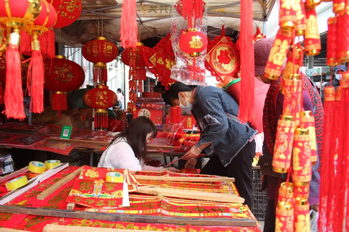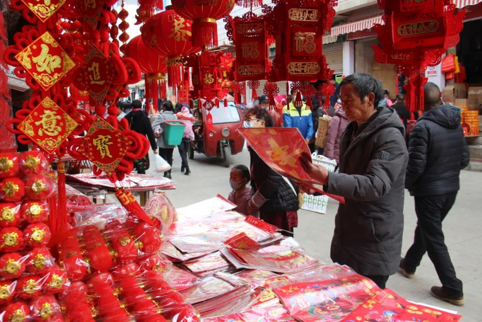丽江市永胜县,在做好疫情防控的同时,市场里摆满了年货,火红的灯笼、对联……浓浓的年味,吸引永胜民众在开心选购,开启了红红火火“迎新春”模式。