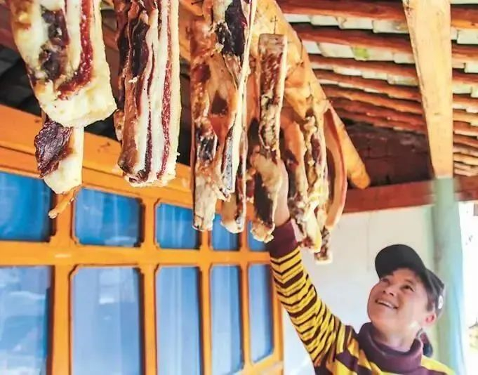 玉溪市峨山彝族自治县双江街道洛泉村村民家的屋檐下挂满了过年的腊肉、香肠,年味一下子浓了起来……