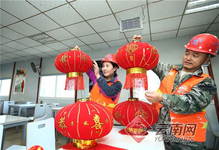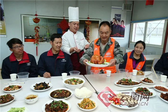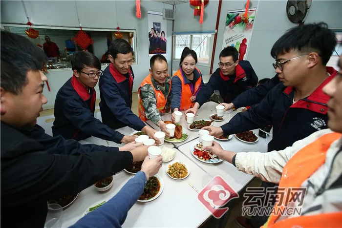 工友们相聚食堂,开开心心吃了顿热热闹闹的“团圆年饭”。