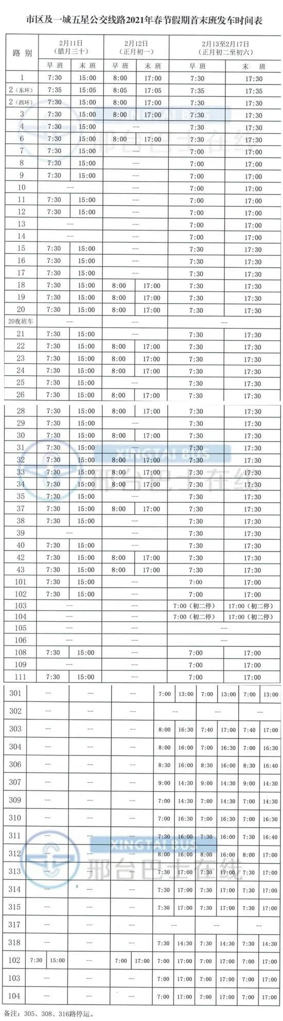 根据河北省交通运输厅《关于印发 2021 年全省交通运输系统春运工作方案的通知》和邢台市交通运输局及邢台交通运输集团有关要求,为统筹做好 2021 年春运疫情防控和运输服务保障工作,响应政府“就地过年”的号召,减少人员流动,使广大市民度过一个和谐、欢乐、祥和的春节,我公司对春节期间的车辆班次及首、末发车时间进行了适当调整,请大家及时了解并掌握乘车时间,以免影响您的出行。