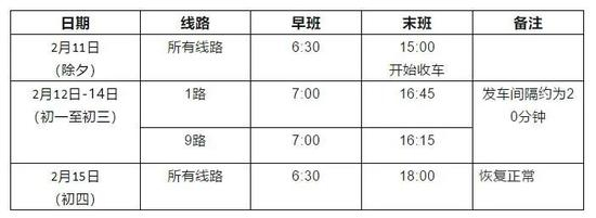 现将春节期间2月11日(大年三十)至2月16日(正月初五)发车时间公布如下: