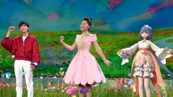 今年的春晚节目《听我说》中,虚拟技术搭建的稻田和无际的花海构成了一个多彩而生动的丰收场景,蝴蝶萦绕、落英缤纷之中,镜头一转,洛天依从莲花中翩然降落到舞台,和童年女神月亮姐姐以及当红偶像王源并肩歌唱。