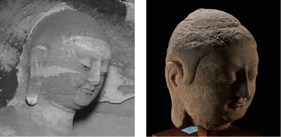 岩田《天龙山石窟》图版41截图(左图),佛首回运后拍摄的高清图片(右图 罗征/摄)转自国家文物局公众微信号