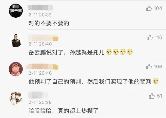 节目中岳云鹏说:“我猜一会儿,我岳云鹏就上热搜了,标题是:岳云鹏说对了!”果不其然,节目刚一结束,#岳云鹏说对了#就上了热搜第一,相声中提到的“左撇子不服”“孙越是托”也都相继上了热搜。