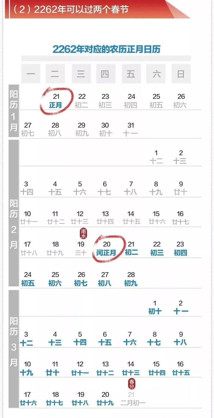 其实农历一年354天并不稀奇,2019年农历己亥猪年是个平年,也只有354天。而有趣的是,根据闰月规则推算,2262年将会有两个春节。大家要加油活哟!