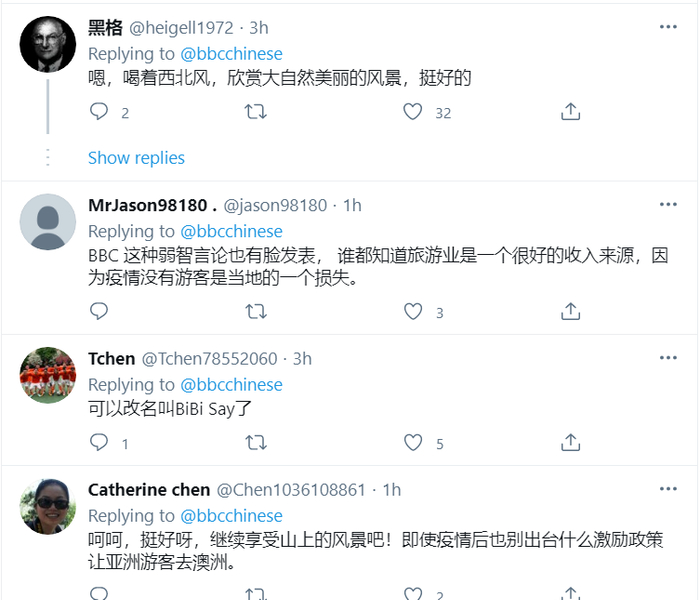 类似的,就在12日晚8点,BBC中文网又推送了一条颇具争议的内容。这条推文称,由于澳大利亚在疫情期间关闭了边境,导致亚洲游客无法像往年一样在春节期间来旅游,因此“当地游客感到松了口气”、“享受山上的风景”。